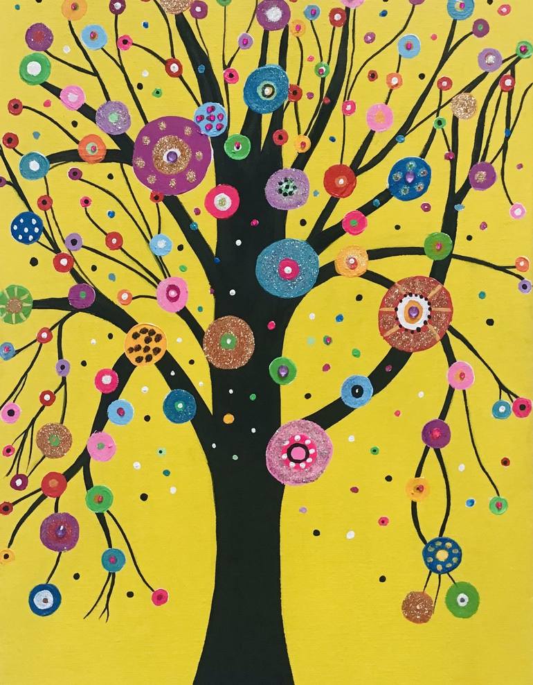 This vibrant piece is inspired by Spring and how it depicts the Circle of Life. It has freshly painted white sides and is strung ready to hang without the need for a frame.