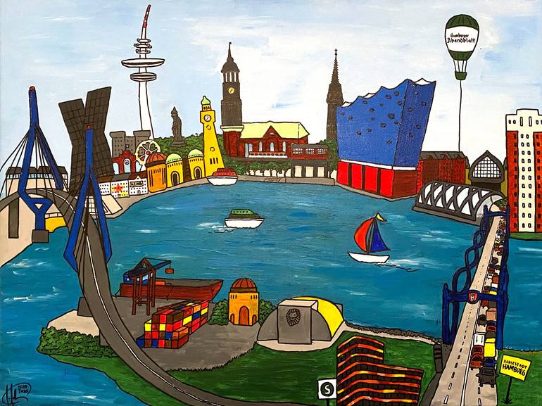 The image shows the city of Hamburg in Germany in a cartoon style. Many of the city's landmarks are represented: TV-Tower, Köhlbrandbrücke, Landungsbrücken, Michel, Speicherstadt, Elbphilharmonie and many more.