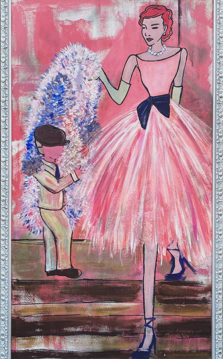I used multiple media on a single large canvas to convey one idea: power. This woman is walking confident, feminine, and powerful as she throws her coat on a service boy. However, I used the mixed media to contradict her power, as the lines are poorly drawn and there are sketches scene even on her f...