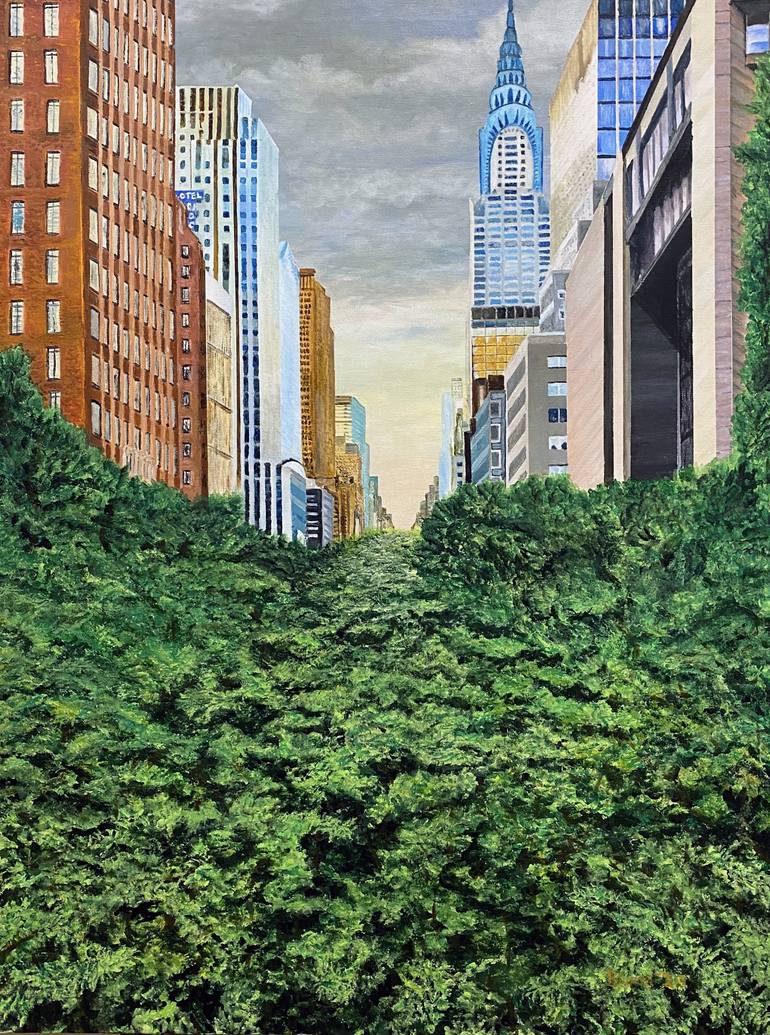 This painting takes a view down Lexington Avenue in New York City with the famous Chrysler Building standing tall amidst the other skyscrapers and turns it into a surrealistic vision where a canopy of trees has overtaken the street and stretches far off into the distance. The rigidity of the buildin...