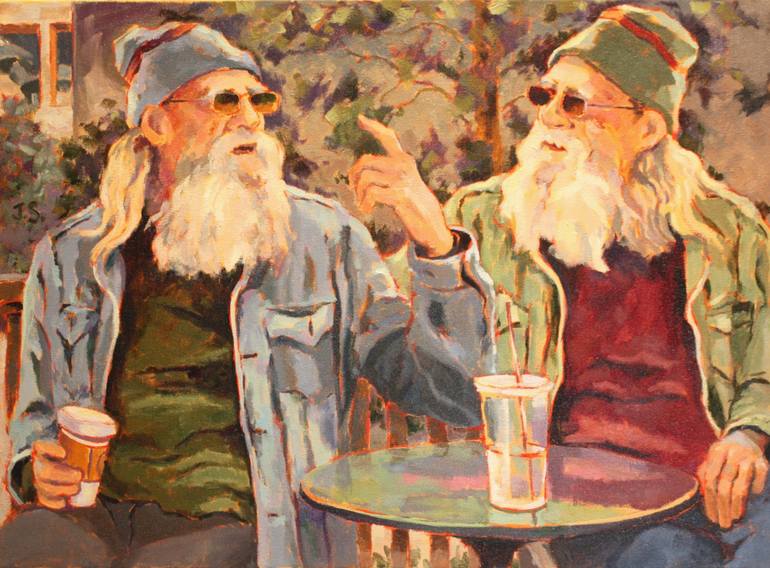 These two men are the same person. I saw this man outdoors in front of a coffee house in the small town where I live. He was intensely explaining a philosophical concept to someone, with wonderful gestures that reminded me of a Leonardo's "Last Supper." I stood there photographing him, and also aske...