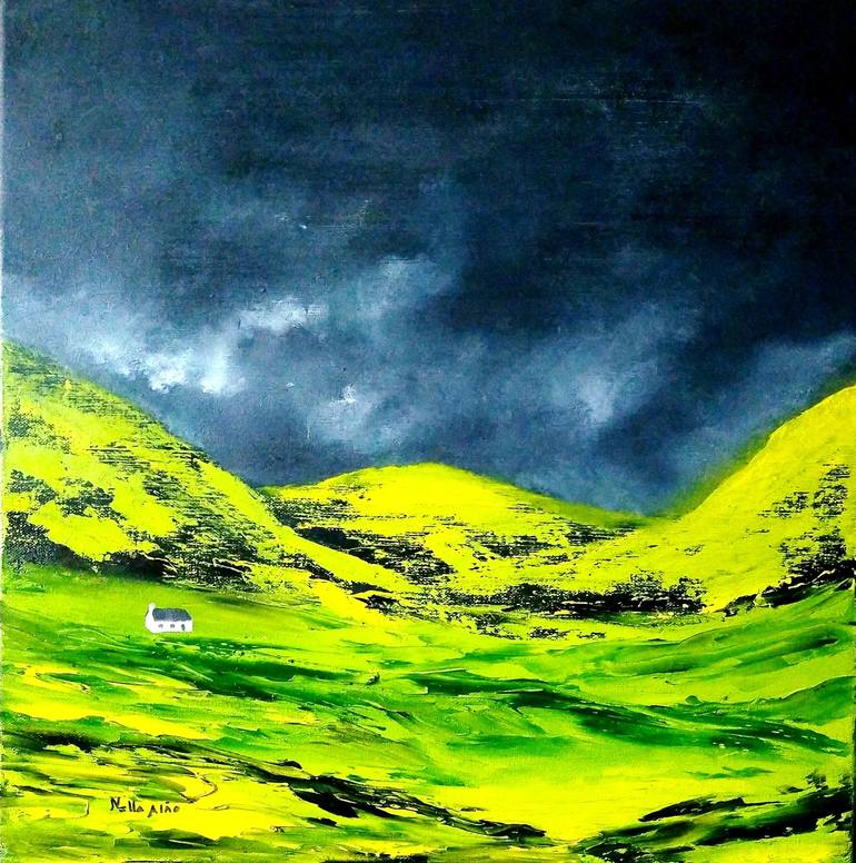 This painting is a version of the Collection North & South with clouds. However I keep a dark sky to make more impressive and giving a dramatic landscape. The cottage looks small with near majestic mountains like the cottages in Highlands. Impressive and lonely however transmitting tranquillity.