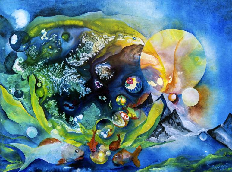 "Council of Fishes" - a mystical world in the style of surrealism, semi-abstract mountain ranges, strange worlds, an eagle can be recognised in the sky, fish seem to consult with each other. A mysterious picture, the world of sky and water - an invitation to let the imagination wander, to calm down...