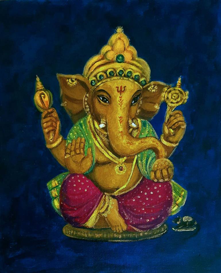 This Ganesh painting is SOLD. Commissions are open via Saatchiart. Cute Ganesha with beautiful eyes that twinkle with mischief! This Ganesha is sure to bring you luck and prosperity with his radiant smile! This bejewelled Ganesha will be surely loved by all! Artists' acrylics on primed canvas board....