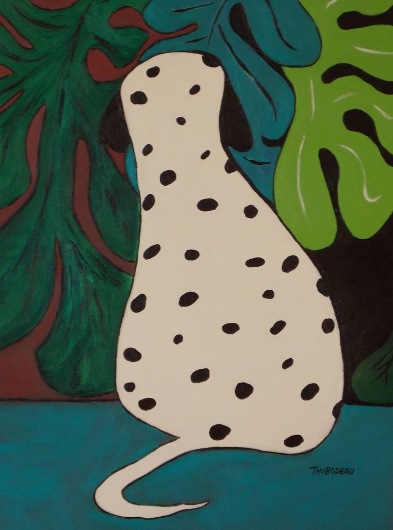The Dalmatian, A Dalmatian dog with polka dots rests in the Matisse leaves waiting patiently on this colorful, acrylic painting with white sides They're a beautiful dog that date back to Croatia. Originally, they were a hunting dog and also used as a carriage dog in earlier days. The Dalmatian's ea...