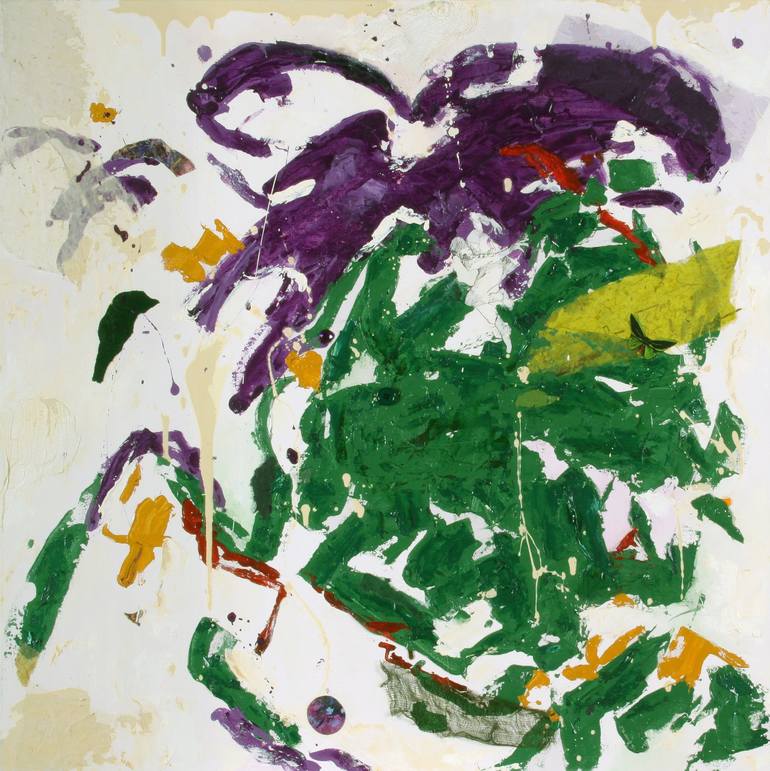 This work is part of my ongoing action series inspired by the 1950's artist Joan Mitchel. I like her painterly style. However. she did not user collage. I do, as I like to include a few things to be discovered.