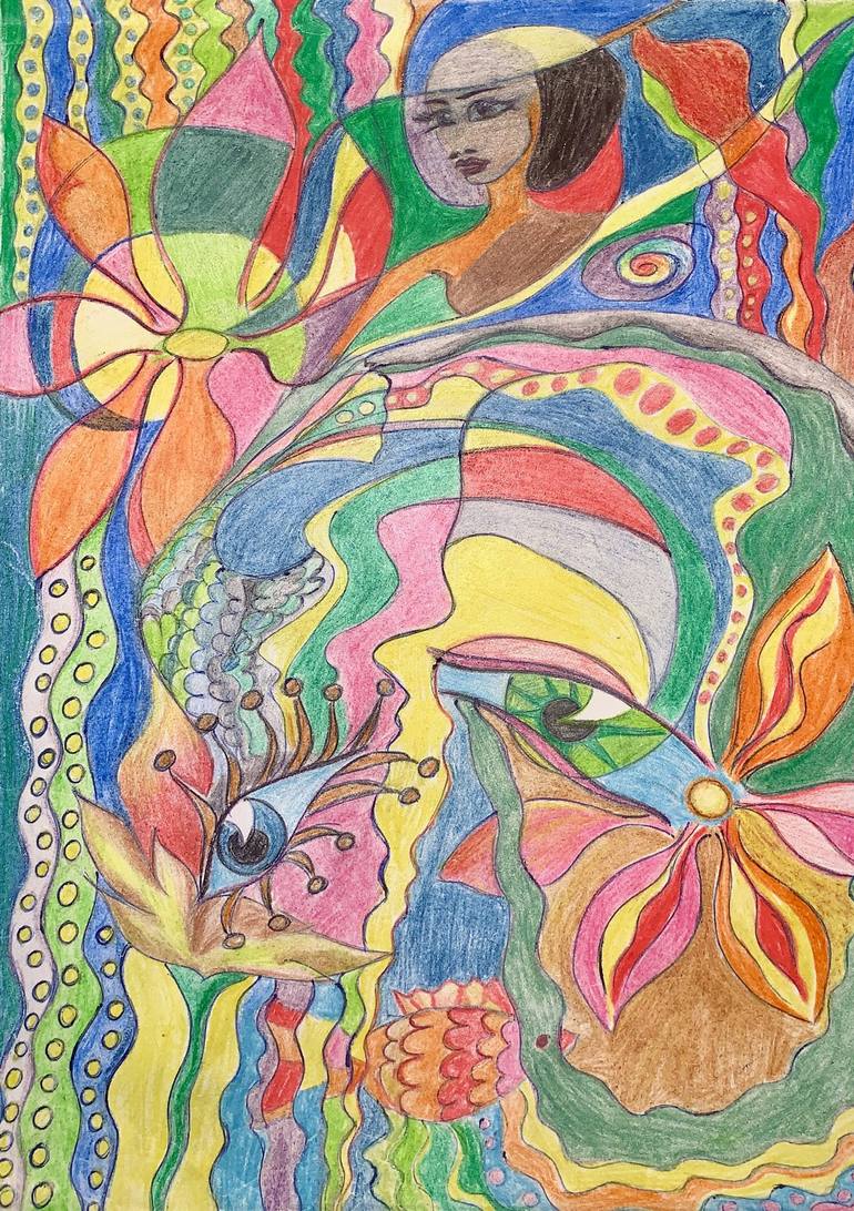 Behold, dear traveler, the story concealed within [A colorful pencil drawing of an abstract female figure surrounded by flowing shapes and patterns, representing the dynamic nature of women's lives in various cultural backgrounds. The background is filled with vibrant colors, creating a lively atmos...