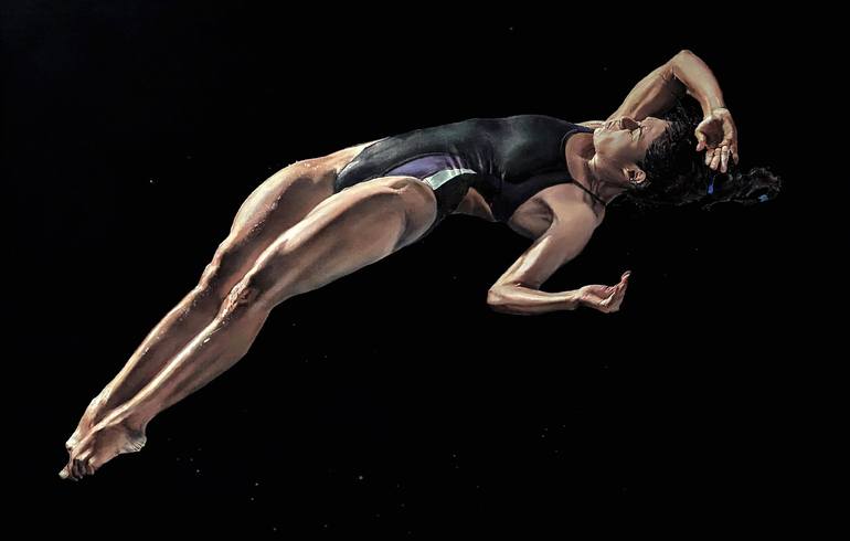 After watching her compete at the Tokyo Olympics I got in touch with Mexican diver and Olympic medallist Gaby Agundez in order to create "The Dive" an oil and acrylic painting. In it I explore the profound human experience of immersion, both physically and metaphorically. The painting captures a mom...