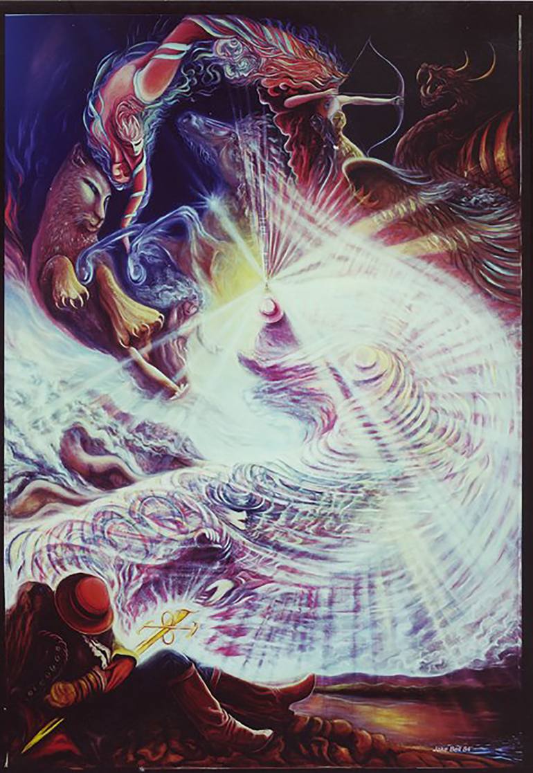 Created first from an imaginary drawing based upon the modern writings of Jane Roberts "The Seth Material" in which there is a phrase "The Dreaming Self is as Real as the Waking Self is a Dream". The drawing was transferred to a very large canvas and following classical techniques of under-painting ...
