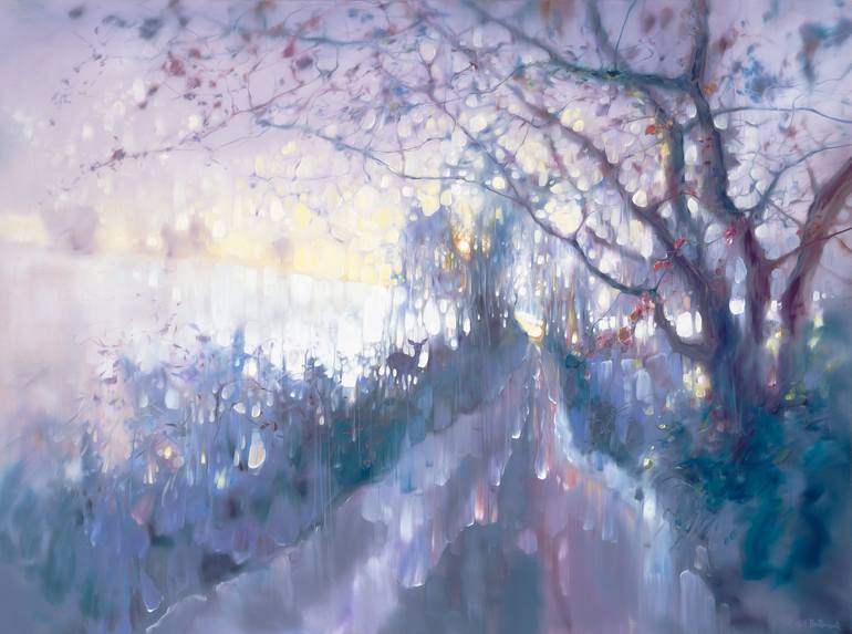 The Eldritch Hart is a large original oil painting of a frosty January morning in England with a lone deer hart watching from the shadows of the path. It is a 48x36x1.5 inches oil on canvas. It is semi-abstract and unique in style and seems to shimmer between reality and abstract. The painting was i...