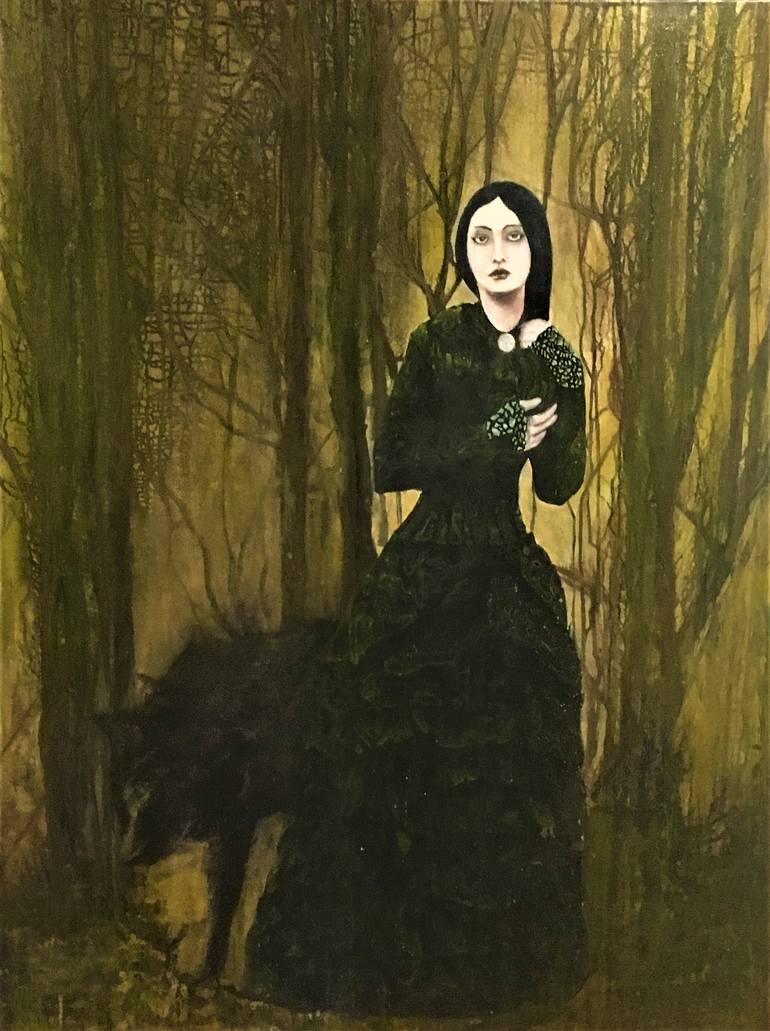 The emerald dress is the colour of arsenic and death. The femme fatale witch with the black dog spirit guardian guards the entrance to an eerie forest.
