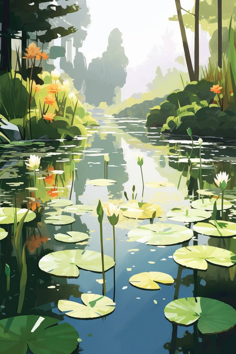 luminous landscapes and minimalist wildlife art unite to create a green-themed artwork capturing the serenity of a secluded pond and its inhabitants.