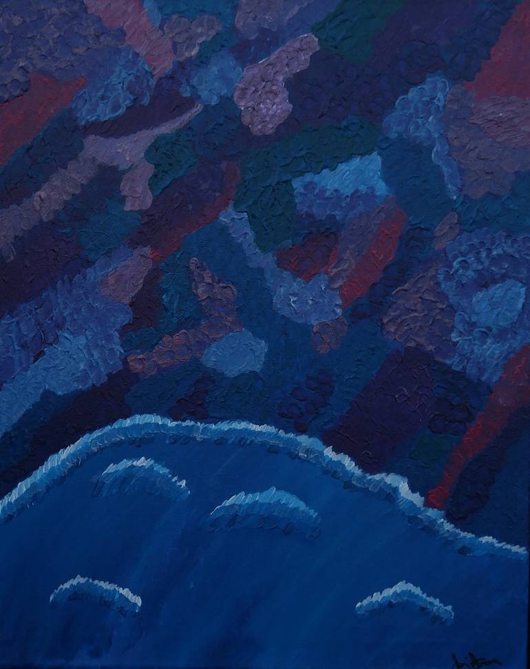 The Eye of My Storm is an abstract paining of a storm in the ocean. This painting features color tones, blue, green and purple are the main colors