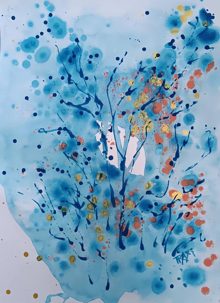 The Eye of Nature – Abstract Watercolor Painting A mesmerizing abstract watercolor painting that captures the essence of nature’s fluid beauty. Swirling shades of blue dominate the composition, evoking the depth of water, sky, or an ethereal landscape. Delicate tree-like forms extend gracefully, th...