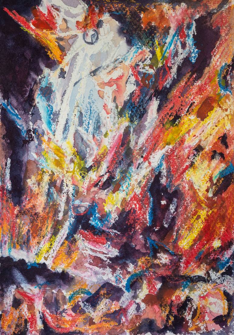 I created this abstract in a sort of trance all in one sitting, inspired by the energy and movement of Rubens' The Fall of the Rebel Angels. I mirrored the flow of bodies in his monumental painting, but imbued it with an energy all my own. The blurs of the kinetic lines criss-crossing the piece make...