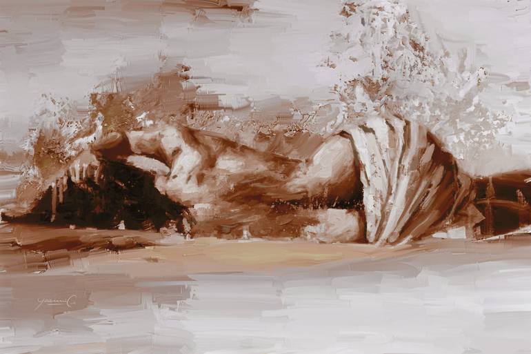 This abstract painting features a reclining, colossal figure that appears to be a crumbled statue. The earthy tones and expressive brushstrokes create a sense of decay and ruin, as if the figure is eroding into its surroundings. The painting evokes a feeling of quiet desolation, as if the viewer is ...