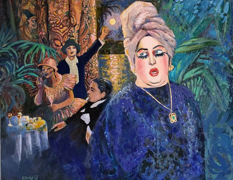 I have used a few different references for this painting, from Agatha Christie Death on the Nile, to old photos from early 20th Century, and a contemporary character/ instagram connection. The Faux Pas is a title the viewer can read into as they like. I feel the faux pas is that the group in the ba...