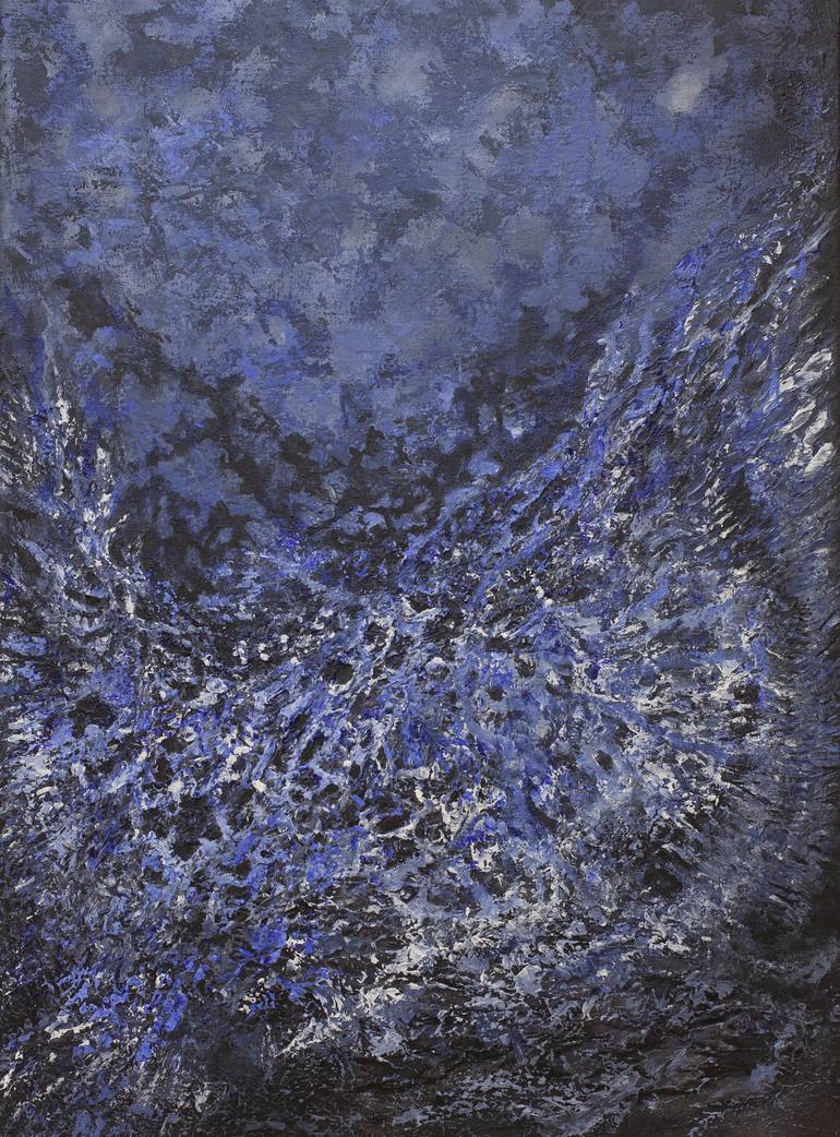"The flight" 70×50 cm The painting is painted in a limited palette of titanium white, ultramarine blue, Berlin blue, and raw umber . This picture is a visualization of my visions that occurred during the immersion in the anesthetic sleep during the operation . I felt like I was part of a circular me...