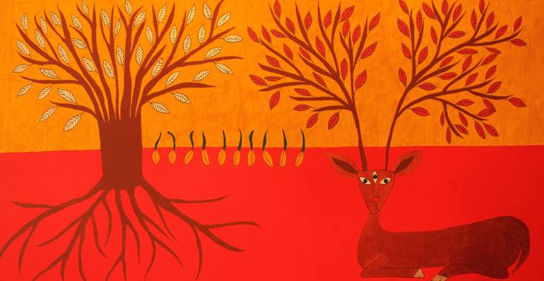 The Garden 147х75, acrylic on canvas 2014 The deer symbolizes the creature, which submerges deep inside, into the ground, to wait and gain strength. The third eye of the deer – the symbol of awareness. The red color of the ground is the blood – the life-giving power, primary energy of life, fertile...