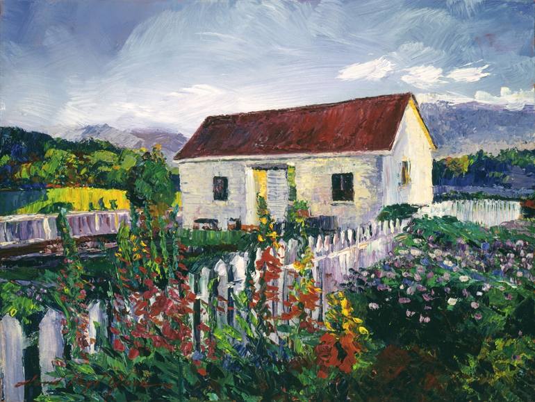 Impressions of a Gardener’s work shed surrounded by a white picket fence and blooming early summer flowers. Palette knife oil on canvas painting 30.4 x 40.6cm by David Lloyd Glover