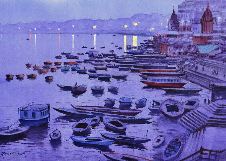 An original watercolour piece depicting the view of the ghats in Varanasi at dusk. This painting is made on Fabriano Artistico 300 gsm paper using artist-grade watercolour paints. Signed and accompanied by a Certificate of Authenticity.