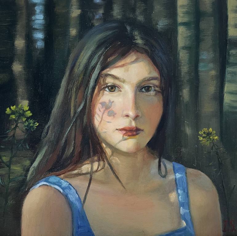 In my painting, "The Girl and the Light of the Forest," I capture a serene moment amidst nature's embraces. A young girl stands amidst the dappled sunlight filtering through the forest canopy, her face gently kissed by the golden rays of the sun. A delicate shadow, cast by a nearby flower, caresses ...