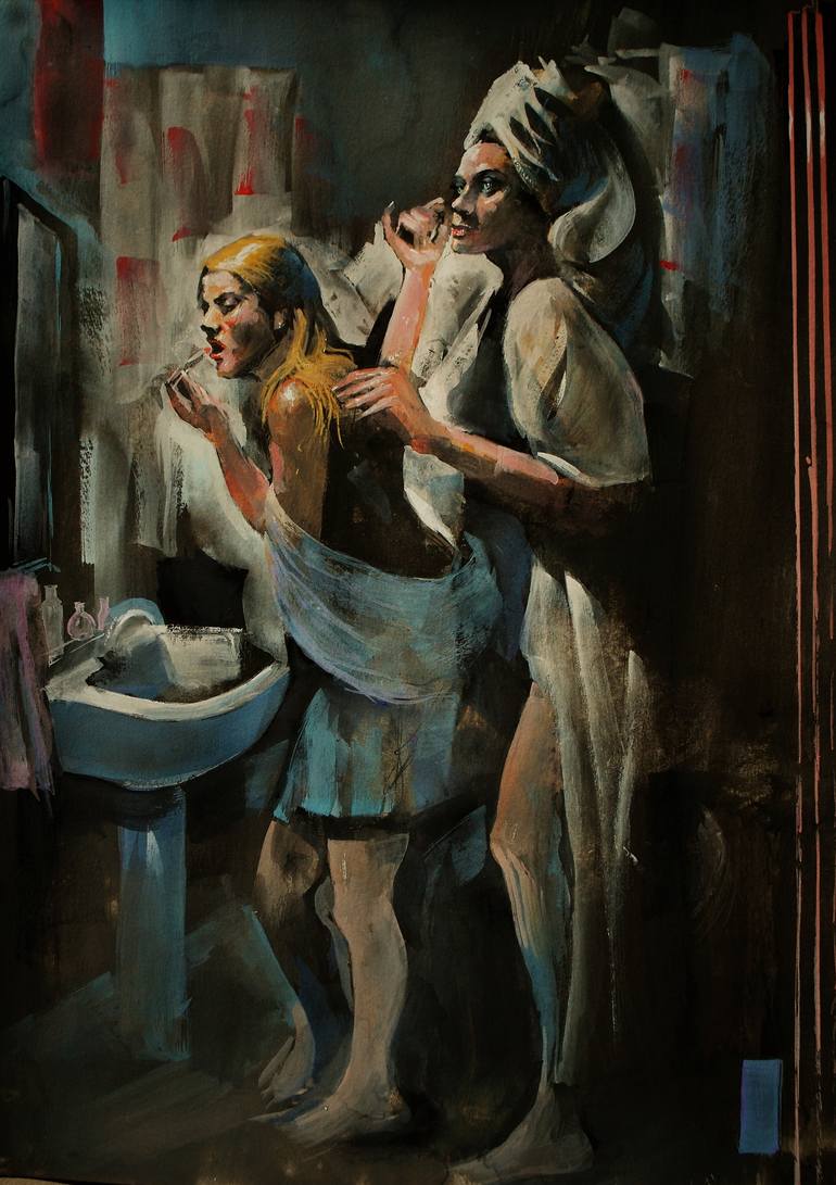 Two girls dressing for the evening.The beauty is the best friend with happiness.The Jung girls are preparing thyself for a adventure.This is a magic moment.