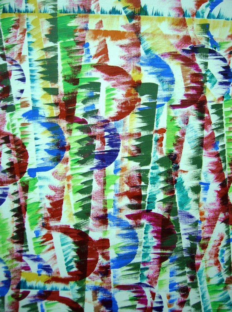 Abstract acrylic painting on a acrylic paper depicting a shoal of curved fish gliding through an underwater forest of multi-coloured seaweed.