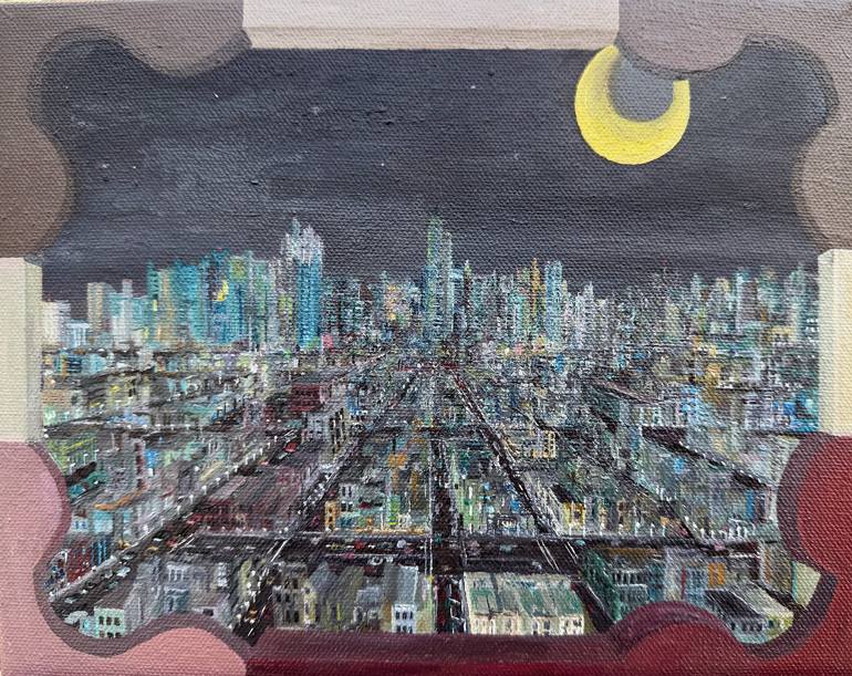 In The Glowing Grid, Leopold captures the pulse of a modern metropolis from above, where illuminated streets and high-rises shimmer beneath a crescent moon. The puzzle-piece border frames the city as both mystery and mechanism—each building a fragment of urban complexity. With vibrant color, geometr...