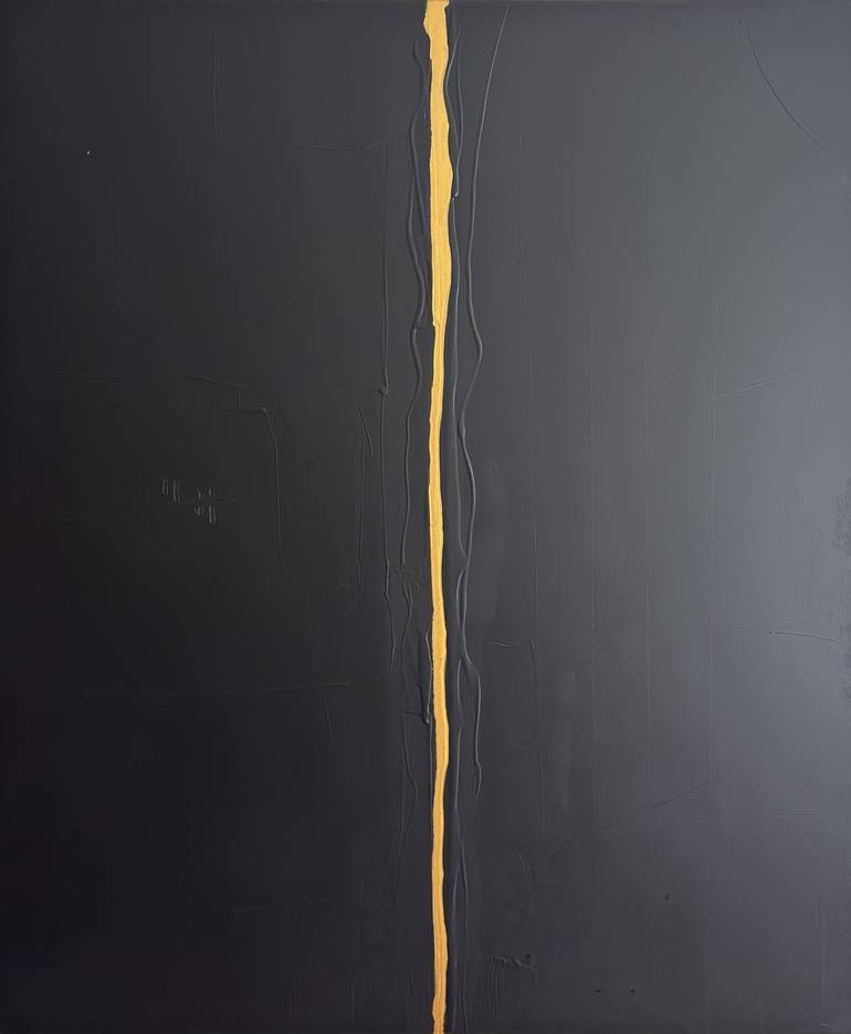 Absolute reduction. A space in which perception dissolves, held together by deep blackness. And yet—a single line. Is it a rupture or a seam? A boundary or a transition? Gold tears through the darkness, raw and unrelenting, a moment of pure presence. Is this defiance or surrender? A flaw in the syst...