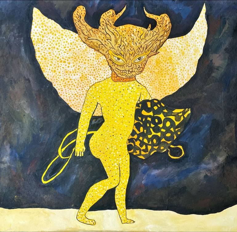 This work portrays a surreal golden being — part celestial, part mischievous trickster — emerging from the darkness like a vision. Its horned, flame-like head and patterned wings evoke an ancient, otherworldly presence. The intense gaze and confident stance suggest a guardian or deceiver, blurring t...