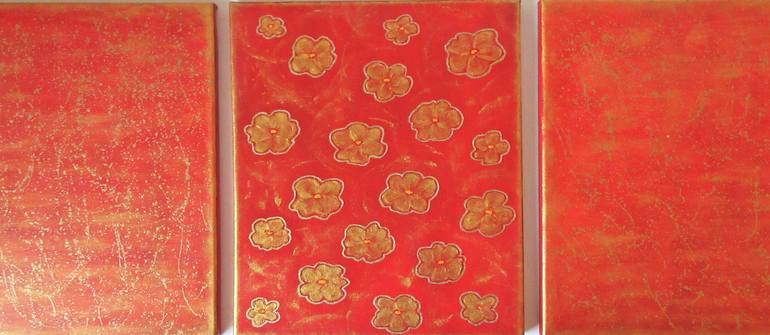 The triptych was created at the summer of 2013th, and the warm colors in these artworks, that range from red to gold reflect the warmth and light of the happy summer days. I named the artwork" The Golden Warmth of Summer". I used real liquid gold leaf to outline flowers at the central canvas, and fo...
