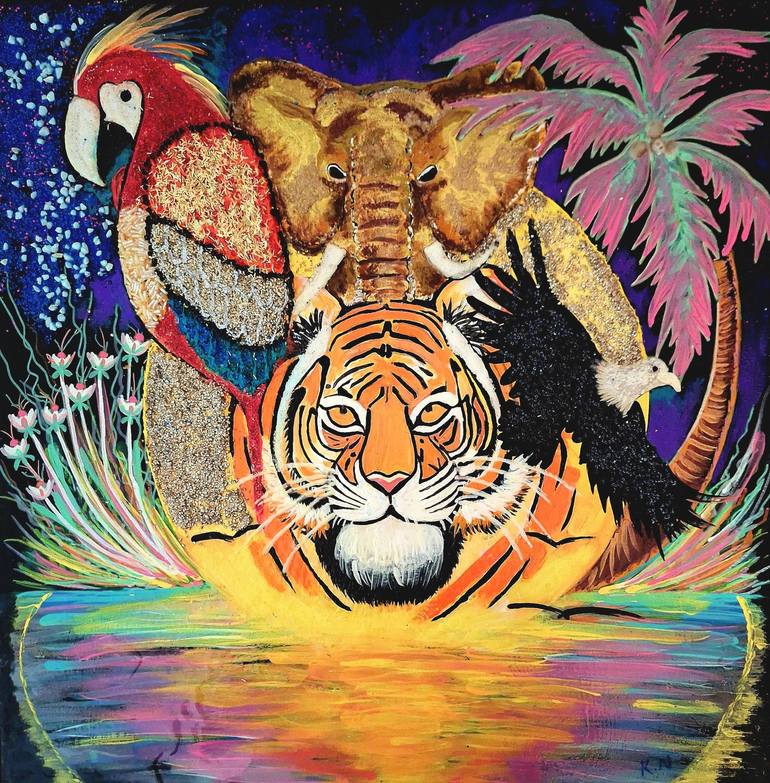 This mixed media painting is titled "The Guardian Spirits of the Jungle." In this piece, I blend vibrant acrylic colors with textured materials to bring the jungle’s majestic guardians to life. The central figure, a regal tiger, emerges from a glowing, reflective water surface, symbolizing power and...