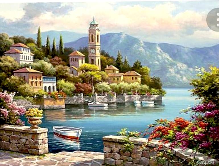 It is an acrylic painting depicts a village on the shore of a lake, with a clock tower prominently featured in the centre of the composition. The painting is done in a realistic style, with careful attention to detail. The village is surrounded by trees and mountains, and there are a few boats in th...