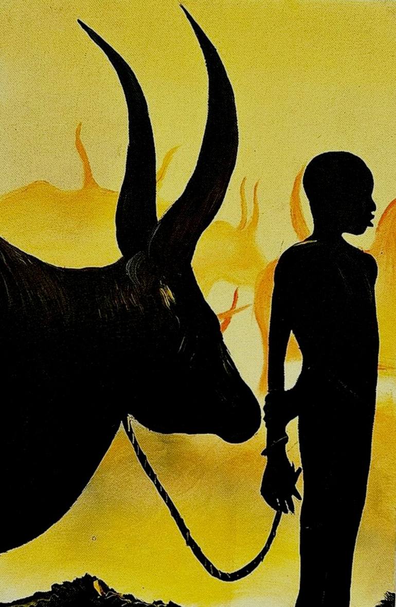 A Large Ox with prominent horns stands next to a Boy holding it's Rope,Both silhouetted against a warm,golden Background,Both the Boy and the animal appear Calm and Connected with other indistinct shapes in the Background hinting at a herd.