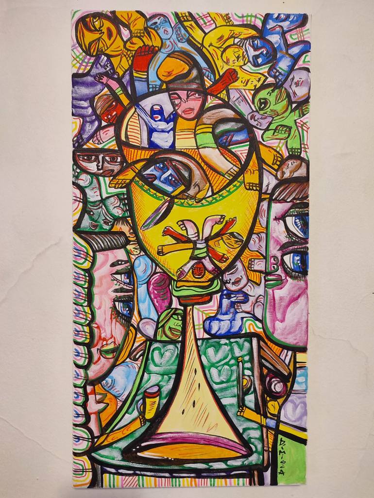 "Dimişcă is in a relation of dependence with the new figuration, as Robert Combas, Dirosa.. Dimişcă has got everything to be the leader of this Free Figuration. His work is between Raw Art and Contemporary Art. He has boldness in brush, in color. He has spontaneity in ideas, in the narrated happenings. He is a narrative painter. His inspirational source is the great culture where from he extracts: mythologies reviewed and improved by himself, folk-tales from his childhood, from his homeland. He paints with a warlike passion, with exaltation, with a great deal of physical engagement. However, Dimişcă doesn’t make war but love through his colors. He can pass from icon to the erotic painting. Both will be full of tenderness and love. Look in the eyes of his characters…they love you! Dimişcă loves you too, as much as he loves Art and Freedom. He helps us to travel back in time, his imagination strikes you, overflows, fills you, hits you with the colors of his characters, from the past, yet so present. What if nothing would be changed, what if everything would stay still…what if everything would be alike…what if there would be no difference…? Dimişcă asks and asking questions means to believe in future. His work is full of that optimism, which is indispensable for the development of the art. Is he a painter? Philosopher? Both, carry him undoubtly to the peak of the art. As all the artists of the world, he is a defender of the freedom of creation. Realism and Utopia lead his hand, he hurries, paints fast, there are many things to be done and the life is so short. He is possessed by grace, it seems that he does everything effortlessly, his easiness, his skill surprises you when you get lucky and have the chance to watch him painting-which is very rare. His bashfulness and shyness makes him more comfortable in the solitude of his workshop than in public. I can write page after page about Dimişcă and his work…, so much did he surprise me, astonish me…he was like a thunder strike. I am sure that Dimişcă will amaze us again. P.S.: If you will visit France come to see the mural painting made by Dimişcă on the wall of my museum from Lapallise, in Allier, in the middle of France. It happened in a spring day, with a golden sun, golden as his yellow colors.