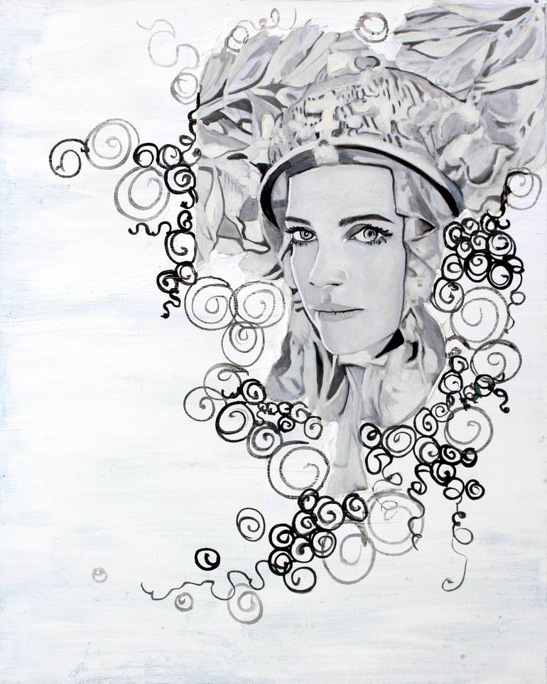 When painting, headdresses and crowns deify Kate Kelton’s subjects. She uplifts the Unsung Sheroes & Heroes, Patriarchy Smashers, Warrior Survivors, Silence Breakers, Philosophers, Truth-Tellers, Whistle Blowers and Thought Giants of all stripes. She paints her portraits cloaked in the garb of statues Ladislav Šaloun sculpted onto the train station that her great-grandfather, Josef Fanta, designed for Prague in 1901 - 1909. Apotheosis through a reclaimed, reapplied Art Nouveau. Sampling her own lineage, she transforms a historical body of work, itself a thing of lasting beauty; exchanging granite for graphite, plaster for paint. In Photoshop, she first combines the desaturated faces she's found, sourced or shot of her chosen subjects, with the black and white photos from her family and friends, of the statues in situ. Then she uses graphite, inks and acrylic paints and glazes to create the works on panel or canvas, literally uplifting and elevating her battle-weary subjects to the highest reach of architectural strata. 'Ancient and distant godlike beings, surveying a dying empire, trade places with the fresh blood of her subjects. The work presents a tactility against the digitized space, and represents a taking, an acquisition of power back from the tastemakers. Here, the mantle of the artist is above brand influencer, above internet commentator, above mere marketability. In their gaze is a warning, “Art is immortal. Come for me, why don’t you?”' ~ Micah Chaim Thomas "Kate's recent work is a matter of expansion through contrast - she is as ephemeral as her subjects are concrete architecture; she is structural when her subjects should slip through your fingers like too-fine sand. Taken as a whole, the works in her magnificent series Sentry are incredibly intelligent, but when looked at individually, you come to understand that these are statements of life beyond themselves. The series take embellishments of a Prague train station designed by her great-grandfather, Josef Fanta, and combines these with portraits of women who have stood against the sexual harassment and assault rampant in Hollywood. These women, like Kate herself, have suffered in the era where powerful men, every bit as immovable as the train station, wielded their power without check. The portraits emblazoned on architectural elements, they are marked against the edifice, every bit as permanent, and perhaps even more defining.