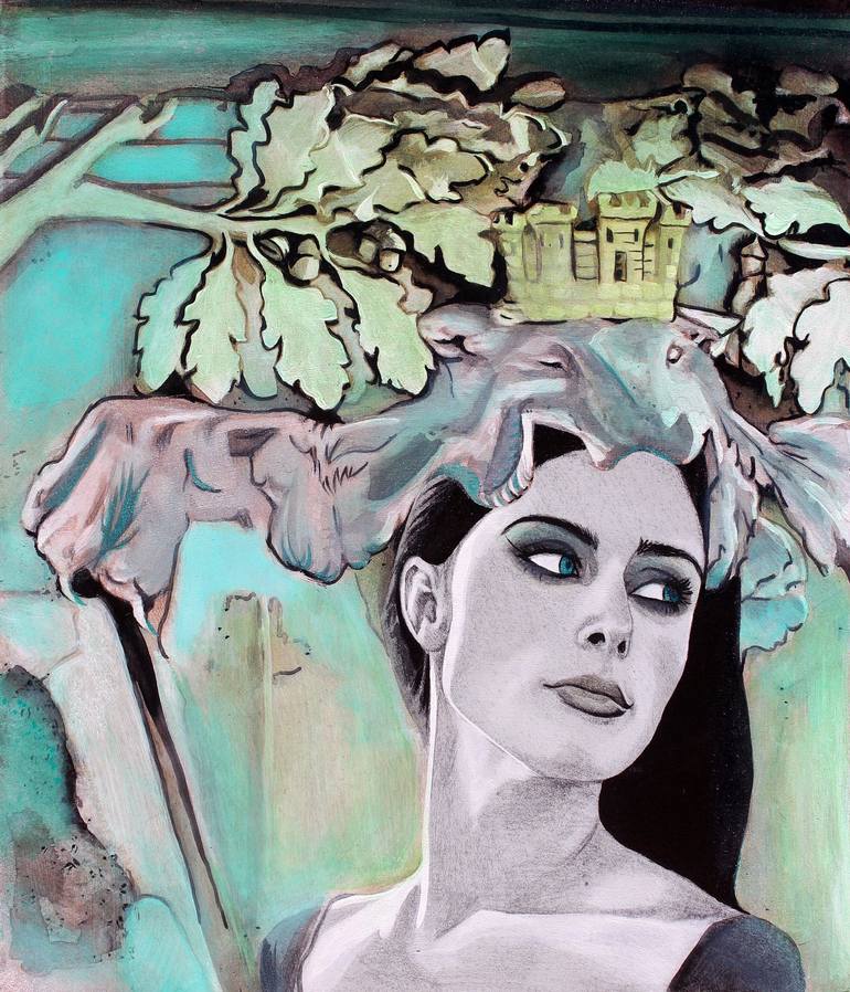 When painting, headdresses and crowns deify Kate Kelton’s subjects. She uplifts the Unsung Sheroes & Heroes, Patriarchy Smashers, Warrior Survivors, Silence Breakers, Philosophers, Truth-Tellers, Whistle Blowers and Thought Giants of all stripes. She paints her portraits cloaked in the garb of statues Ladislav Šaloun sculpted onto the train station that her great-grandfather, Josef Fanta, designed for Prague in 1901 - 1909. Apotheosis through a reclaimed, reapplied Art Nouveau. Sampling her own lineage, she transforms a historical body of work, itself a thing of lasting beauty; exchanging granite for graphite, plaster for paint. In Photoshop, she first combines the desaturated faces she's found, sourced or shot of her chosen subjects, with the black and white photos from her family and friends, of the statues in situ. Then she uses graphite, inks and acrylic paints and glazes to create the works on panel or canvas, literally uplifting and elevating her battle-weary subjects to the highest reach of architectural strata. 'Ancient and distant godlike beings, surveying a dying empire, trade places with the fresh blood of her subjects. The work presents a tactility against the digitized space, and represents a taking, an acquisition of power back from the tastemakers. Here, the mantle of the artist is above brand influencer, above internet commentator, above mere marketability. In their gaze is a warning, “Art is immortal. Come for me, why don’t you?”' ~ Micah Chaim Thomas "Kate's recent work is a matter of expansion through contrast - she is as ephemeral as her subjects are concrete architecture; she is structural when her subjects should slip through your fingers like too-fine sand. Taken as a whole, the works in her magnificent series Sentry are incredibly intelligent, but when looked at individually, you come to understand that these are statements of life beyond themselves. The series take embellishments of a Prague train station designed by her great-grandfather, Josef Fanta, and combines these with portraits of women who have stood against the sexual harassment and assault rampant in Hollywood. These women, like Kate herself, have suffered in the era where powerful men, every bit as immovable as the train station, wielded their power without check. The portraits emblazoned on architectural elements, they are marked against the edifice, every bit as permanent, and perhaps even more defining.