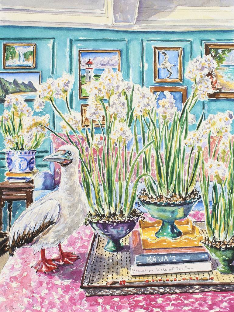 An original 16" x 12" or 40.64cm x 30.48cm, watercolor and ink painting. Kauai, known as The Garden Isle is the theme of this painting. It features a Red Footed Booby who has just landed on the ottoman in a gorgeously decorated room filled with paintings of Kauai, pots of Narcissus, a teal colored...