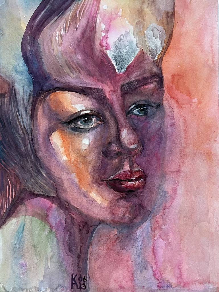 "The Lady Jewel" presents a striking portrait of a woman rendered in rich, jewel-like tones. Her face, with piercing eyes and full lips, emerges from a swirl of purple, pink, and orange hues, creating a sense of depth and luminosity. The watercolor technique allows for a play of light and shadow acr...