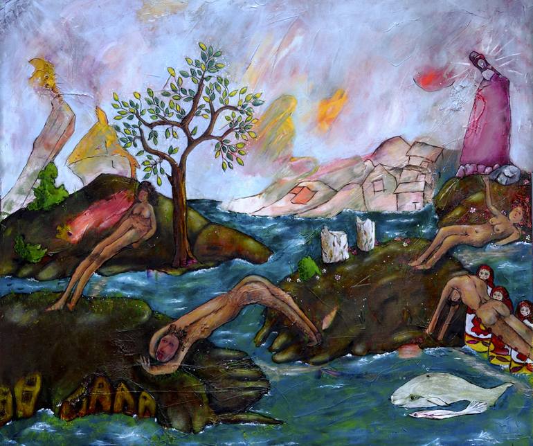 This was painted from the idea of the mothers who build the bridges across the lands and migration and the children that they let go across.