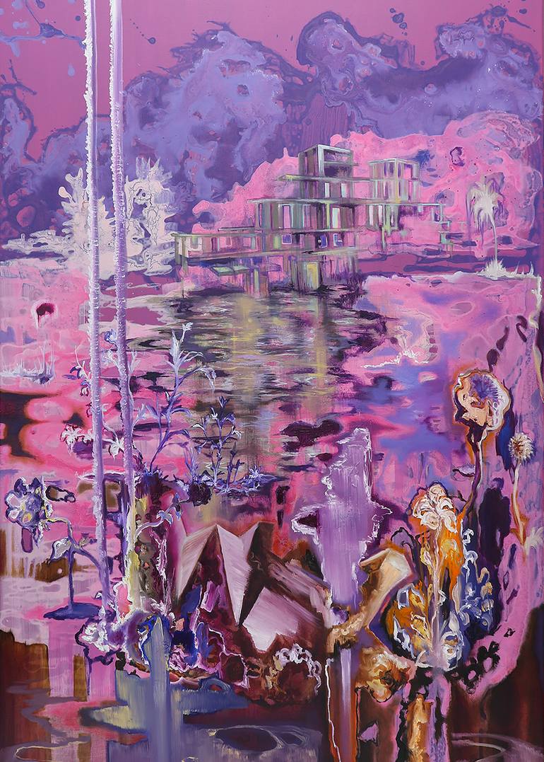 Represented by Galerie Helder, The Hague, The Netherlands Born 1977 in Gouda Living in Goirle, The Netherlands Graduated in 2002 (with Honors) Bachelor in fine arts Bas Wiegmink paints with many contrasts in an exuberant, romantic color palette, sometimes even fluorescent. His cinematic and free manner of painting makes viewing permanently interesting. In his earlier work, trees and plants grow wildly between buildings. Exuberant flora has taken up all the space there with sometimes remnants of human life still remaining. In Wiegmink's new paintings, the flora remains present in powerful, convincing strokes and intense colors, but nature undergoes an apparent ordering. It now floats, as it were caught in an all-embracing grid, in all kinds of changing structures of infinity. Like an escapist, he explores the form in order to constantly renew himself, a contrast that betrays the ambiguity of reality.