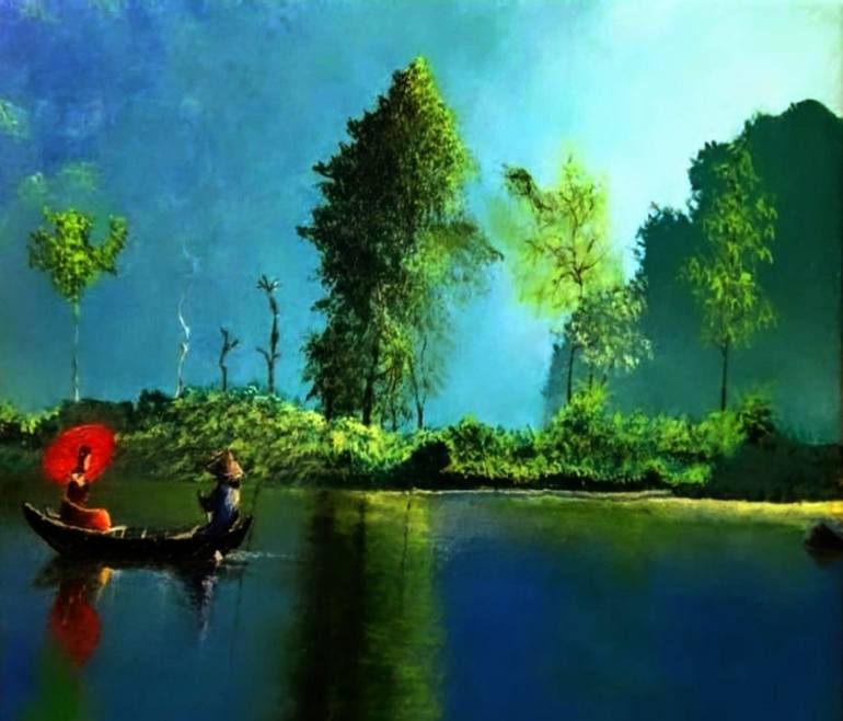 "The Last Journey" portrays a poignant scene of a couple embarking on a final journey together, symbolized by a serene boat ride. The painting is set against a backdrop of a calm, reflective body of water, with a soft, ethereal light illuminating the scene. The couple, depicted in a tender embrace, ...