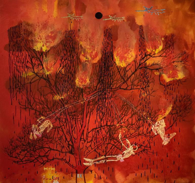 This image is part of a series of catastrophic motifs, either man made, or natural in origin – asteroid strikes, solar flares, war, surveillance, interrupting child play, lost innocence, boiling tar, destruction, global warming, burning, mass extinctions, failed rescue attempts, and the like. We m...