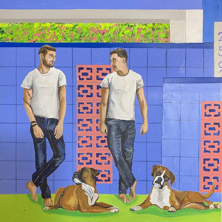 My series of People and their pets in a Palm Springs Mid Century setting. I paint the world I want to live in, colorful and full of love.
