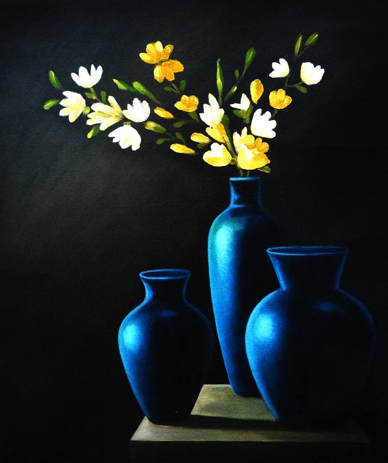 Unframed still life paining composition of natural flowers with blue ceramic pots using oil in canvas