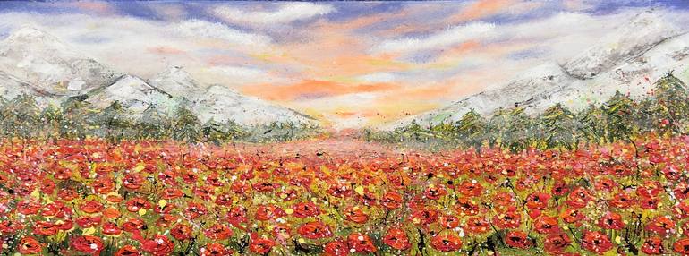 This breathtaking mountain landscape painting captures the beauty of a vibrant meadow filled with crimson red poppies as far as the eye can see. The panoramic canvas showcases the majesty of the surrounding mountain range, with towering trees and snow-capped peaks that seemingly touch the sky. The a...