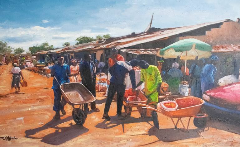 “People don’t buy what you do, they buy why you do it.” _____ Simon Sinek This painting depicts day to day activity of man to meet ends meet. The subject being a typical Nigerian market illustrating buy and selling in an open and segmented shops, with the attention given to light direction, mood, t...