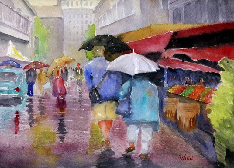 Painting: Watercolor on Paper. This impressionistic image could represent most urban open-air markets around the world. I hope to capture the feeling of walking city streets, smelling the wonderful aroma of local cuisine, coffee houses, and fresh air after a rain storm. The original image is painte...