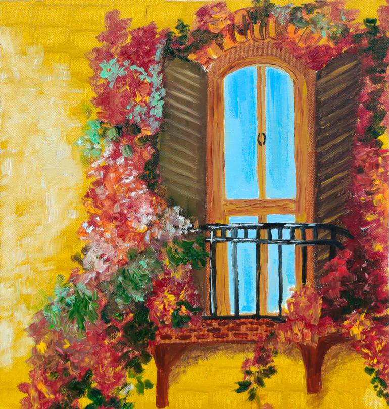 This painting depicts the Mediterranean life, a big balcony and flower vines wrap all around it which reflect a beautiful view to this painting.